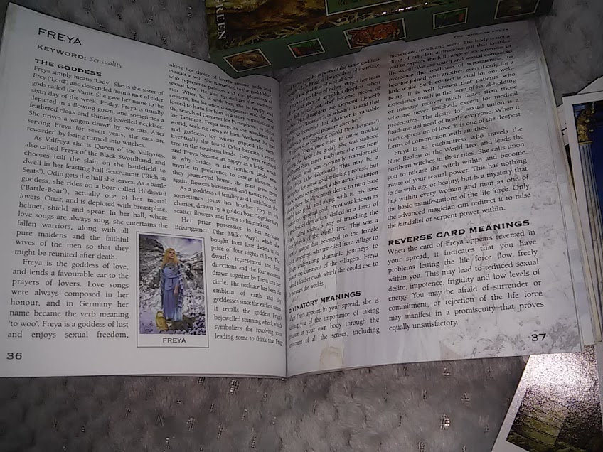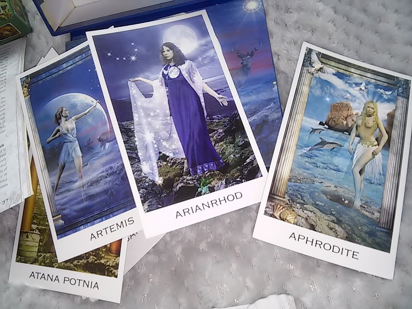 The goddess cards are by Anna Franklin via Vegas, this one: https://www.amazon.com/Oracle-Goddess-Book-Card-Pack/dp/1843336308